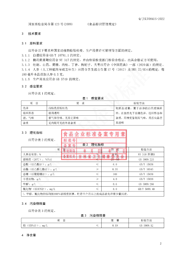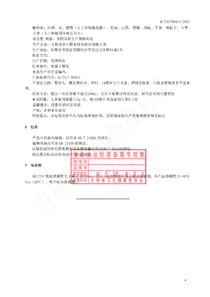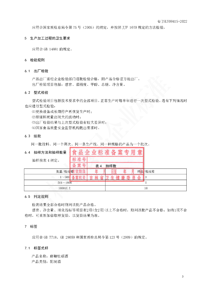 Q/JSLY 0041S-2022 鹿鞭牡蛎酒