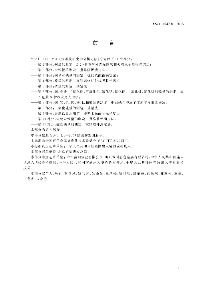 YS/T 1047.8-2015 铜磁铁矿化学分析方法 第8部分:二氧化硅量的测定 重量法