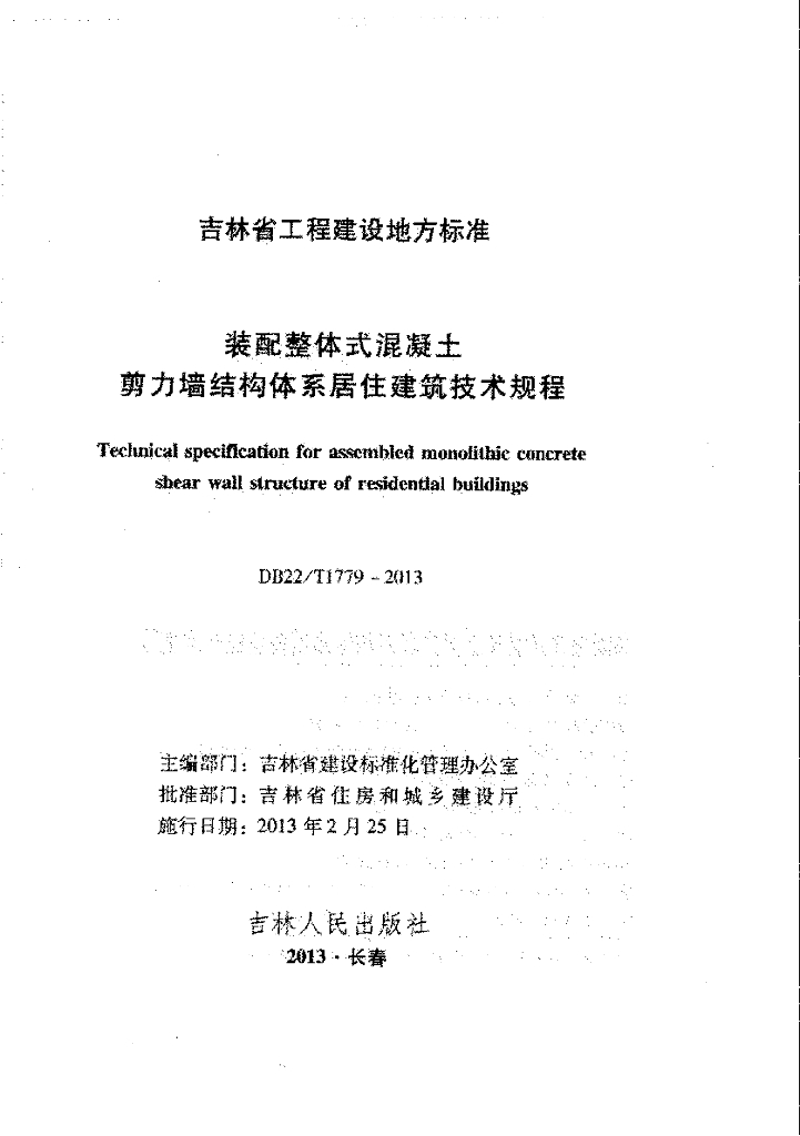 DB22/T 1779-2013 装配整体式混凝土剪力墙结构体系居住建筑技术规程