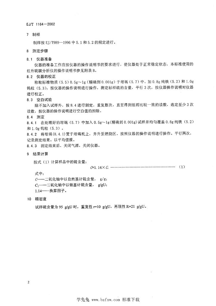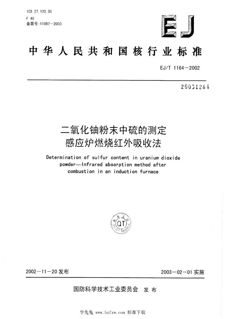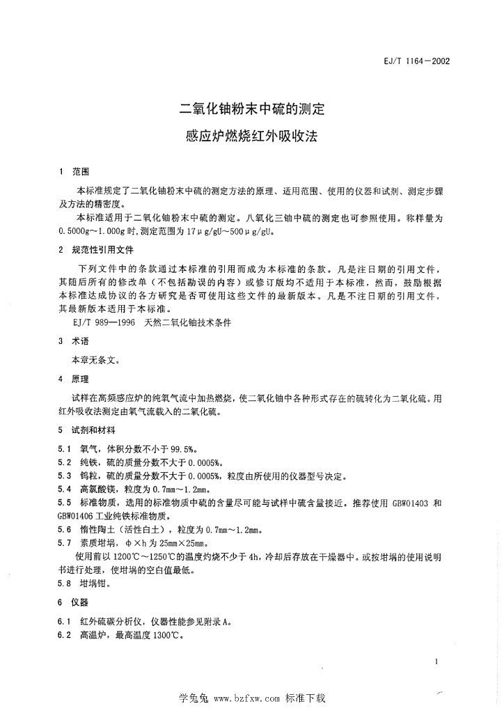 EJ/T 1164-2002 二氧化铀粉末中硫的测定 感应炉燃烧红外吸收法