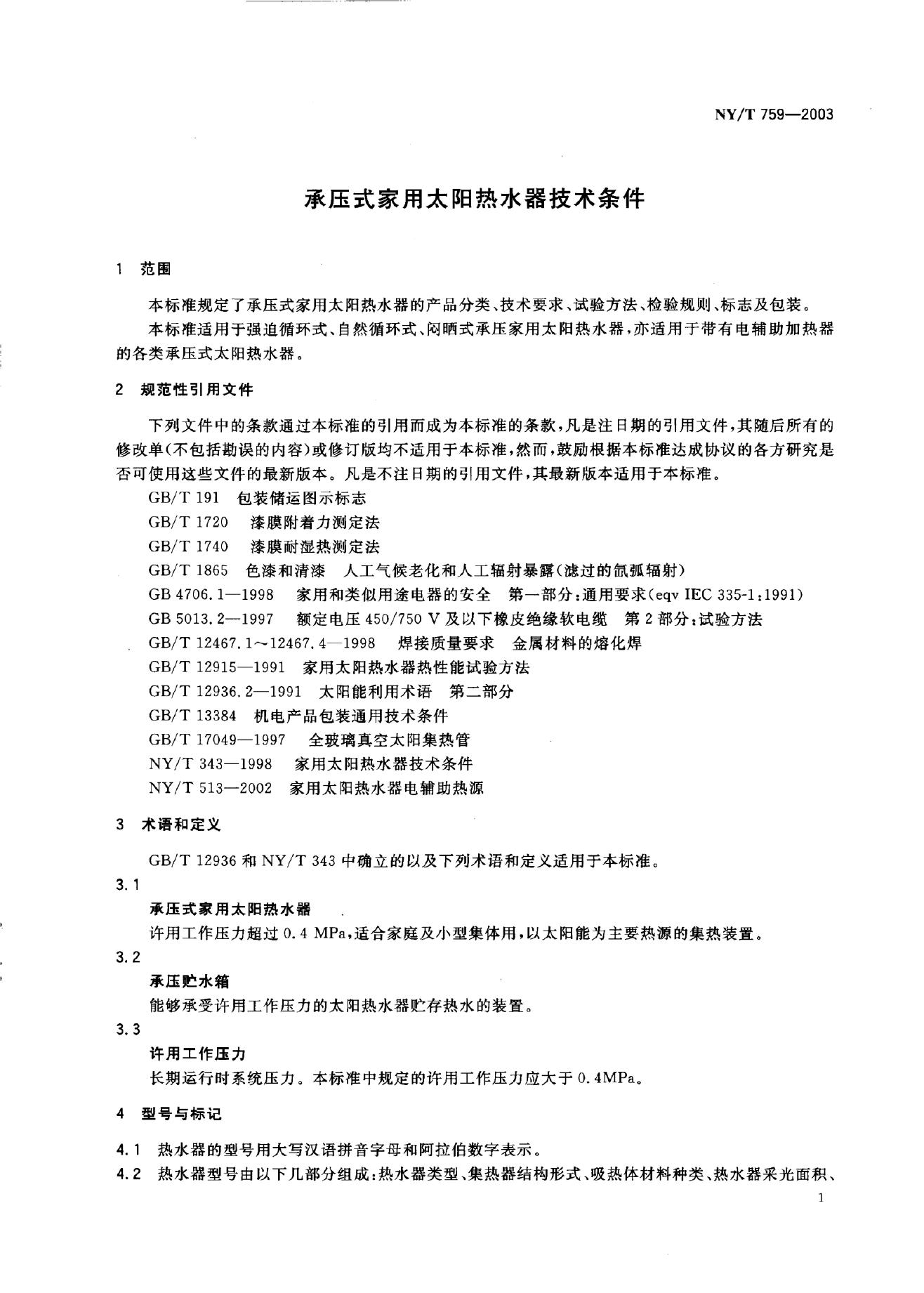 NY/T 759-2003 承压式家用太阳热水器技术条件