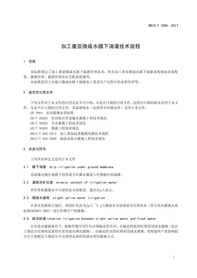 DB15/T 1094-2017 加工番茄微咸水膜下滴灌技术规程