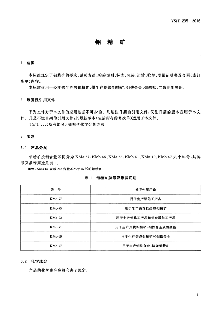 YS/T 235-2016 钼精矿