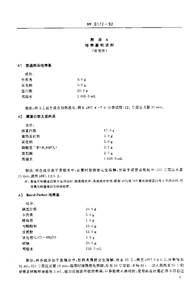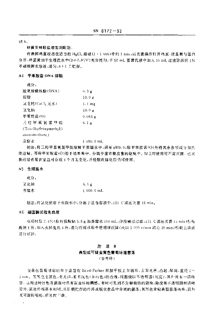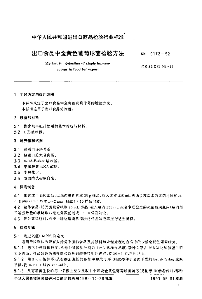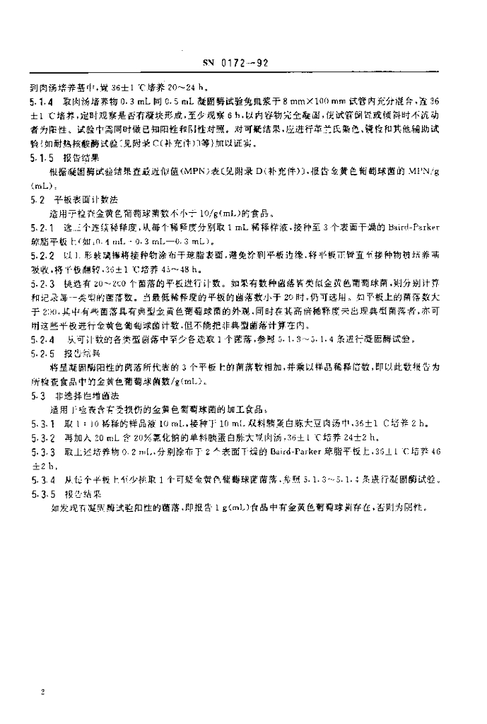 SN 0172-1992 出口食品中金黄色葡萄球菌检验方法