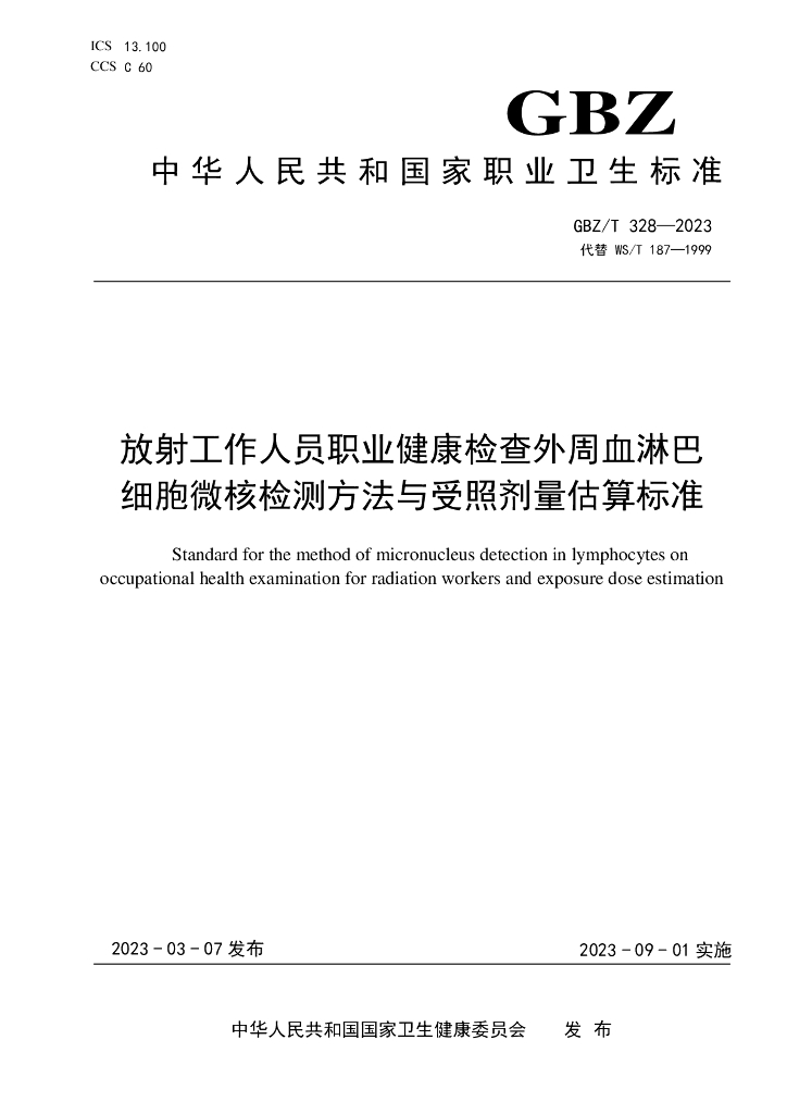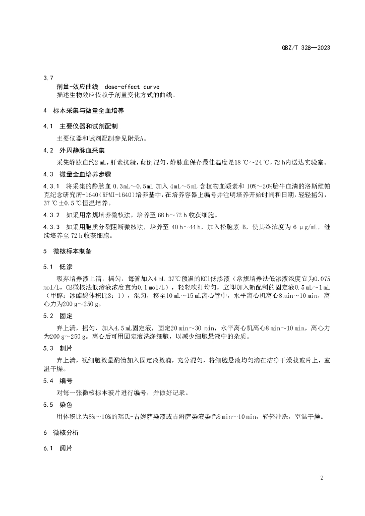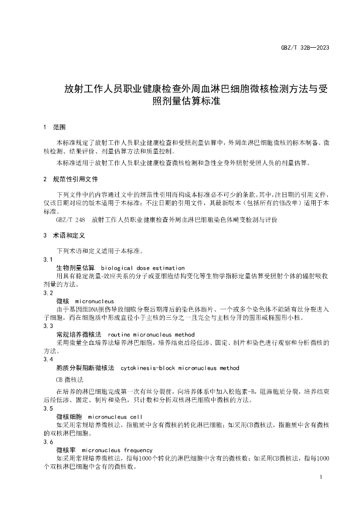 GBZ/T 328-2023 放射工作人员职业健康检查外周血淋巴细胞微核检测方法与受照剂量估算标准