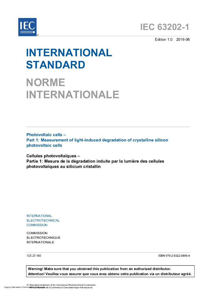 IEC 63202-1-2019 光伏电池 第1部分:光诱导晶体硅光伏电池降解的测量