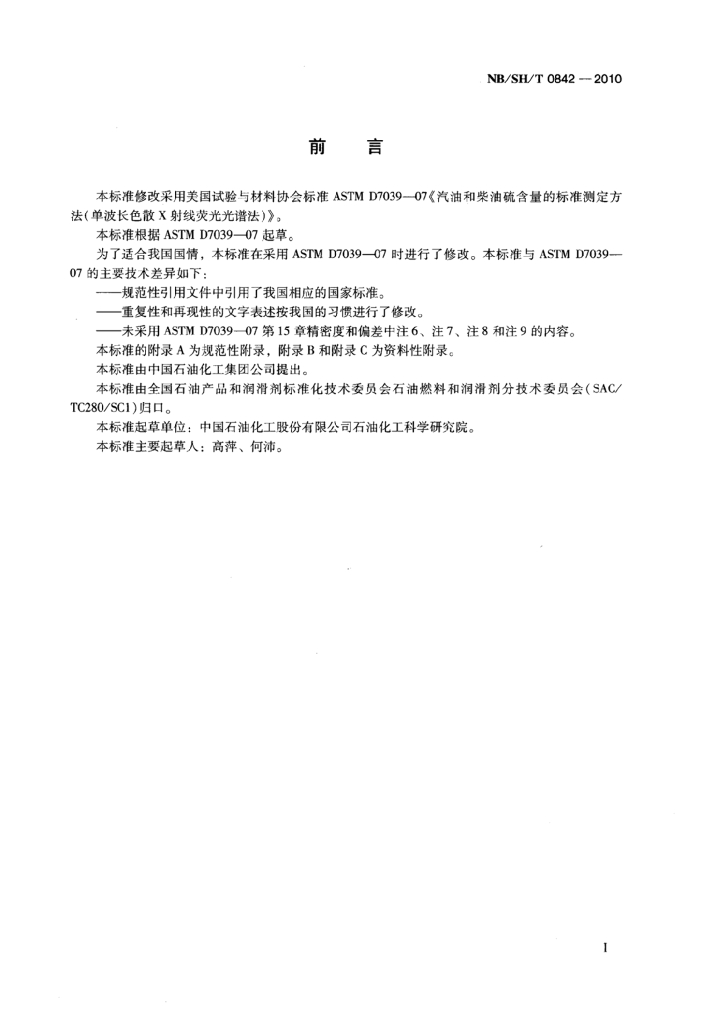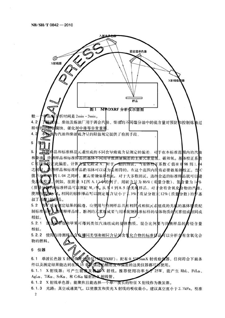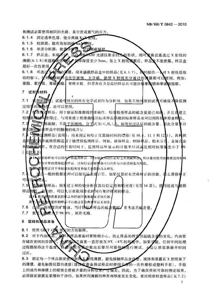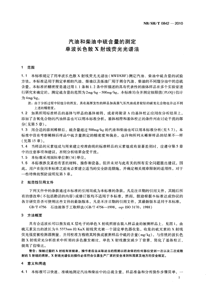 NB/SH/T 0842-2010 汽油和柴油中硫含量的测定 单波长色散X射线荧光光谱法