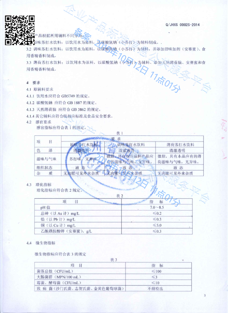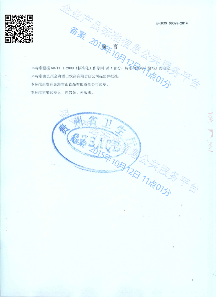 Q/JHXS 0002S-2014 贵州金海雪山饮品有限责任公司 苏打水饮料