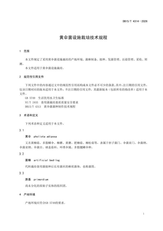 DB15/T 4314-2026 黄伞菌设施栽培技术规程