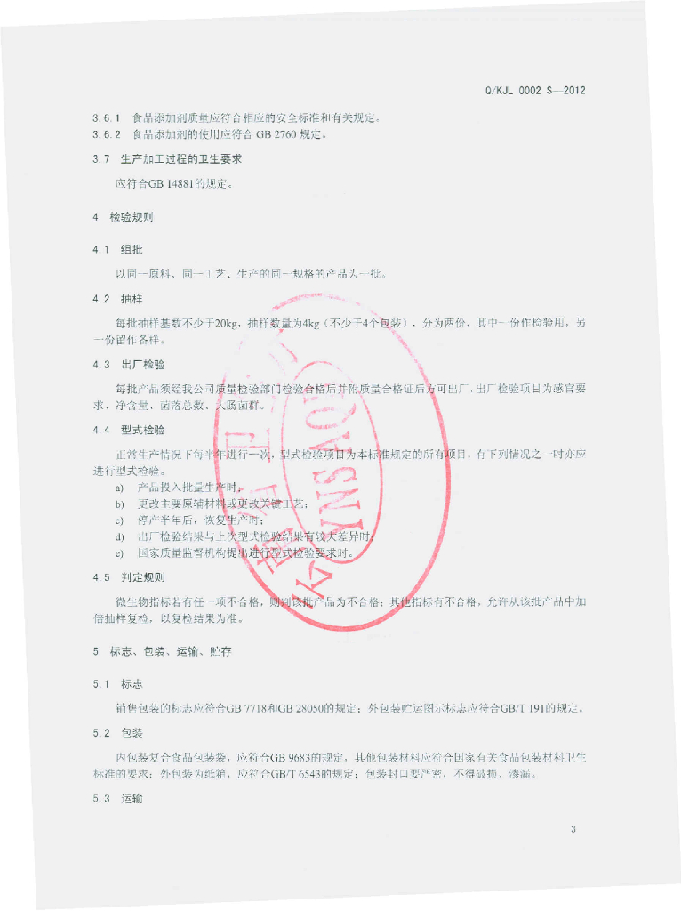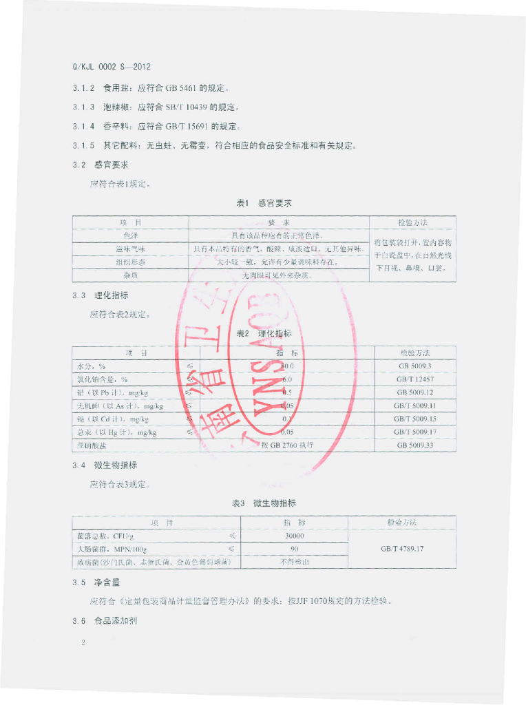 Q/KJL 0002S-2012 泡椒鸡(鸭)爪、翅