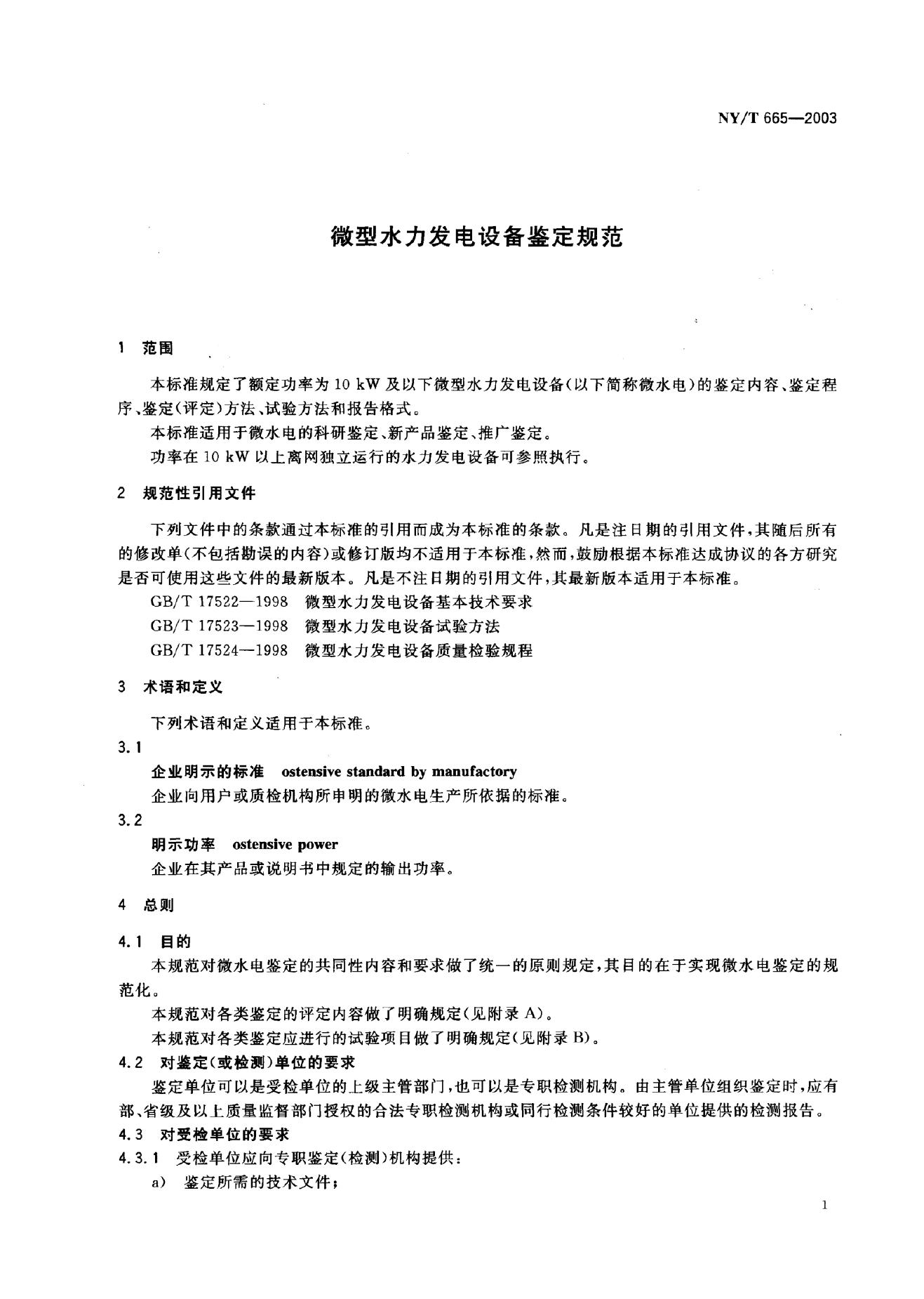 NY/T 665-2003 微型水力发电设备鉴定规范