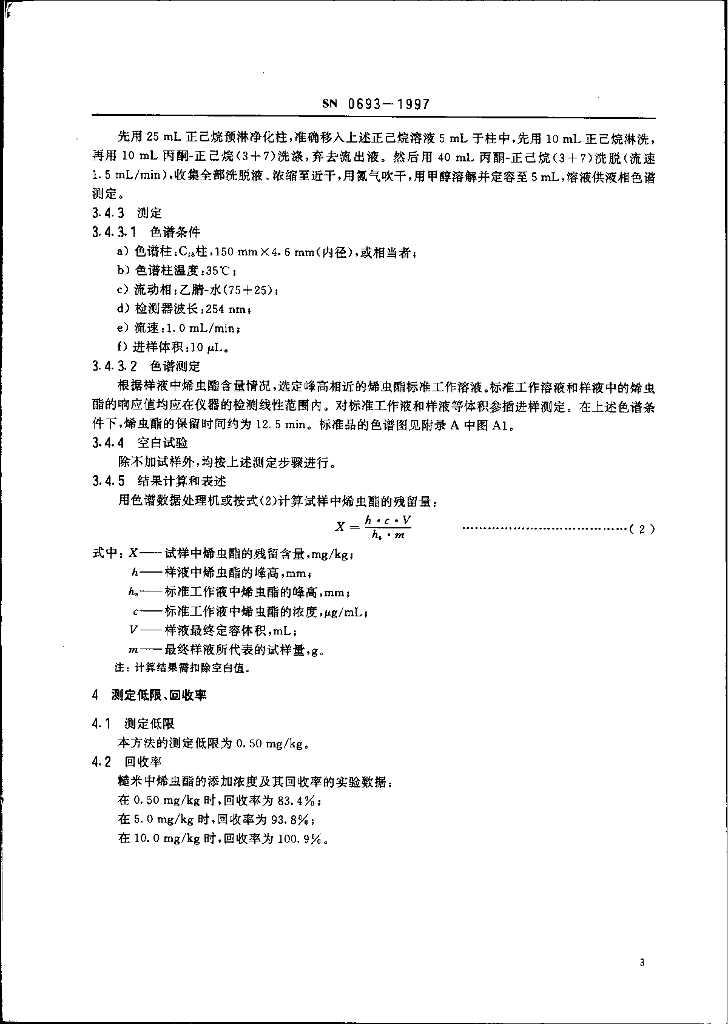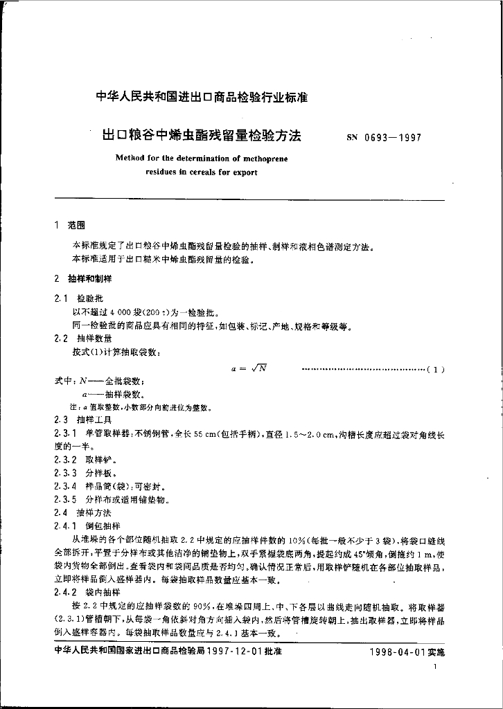 SN 0693-1997 出口粮谷中烯虫酯残留量检验方法