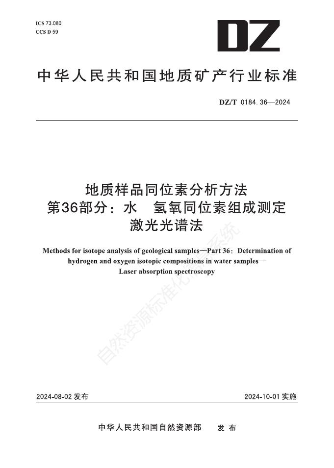 DZ/T 0184.36-2024 地质样品同位素分析方法 第36部分:水 氢氧同位素组成测定 激光光谱法