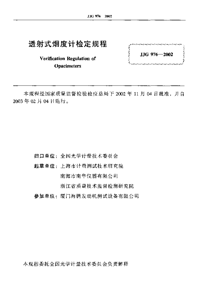 鲍国华(上海市计量测试技术研究院)、杨耀光(南海市南华仪器有限公司)、施建华(浙江省质量技术监督检测研究院)、章熙春(厦门海腾发动机测试设备有限公司)、屠海文(上海市计量测试技术研究院)、严瑾(浙江省质量技术监督检测研究院)、林勇明(厦门海腾发动机测试设备有限公司)