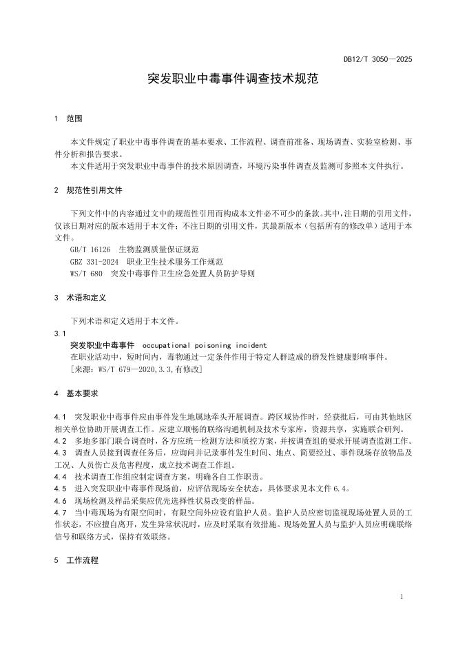DB12/T 3050-2025 突发职业中毒事件调查技术规范