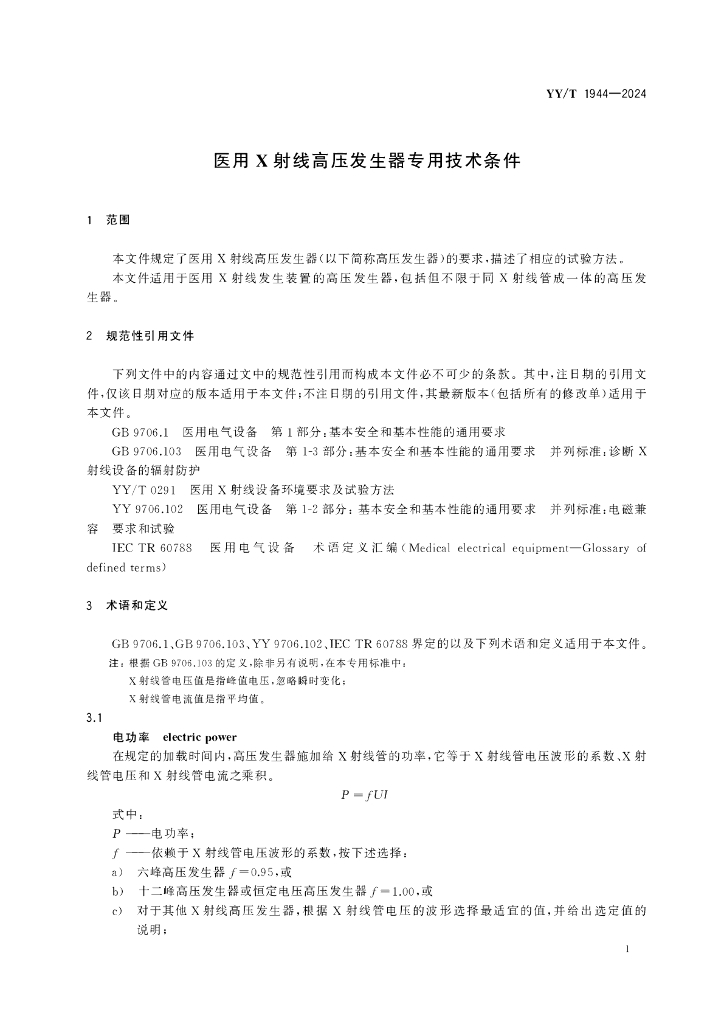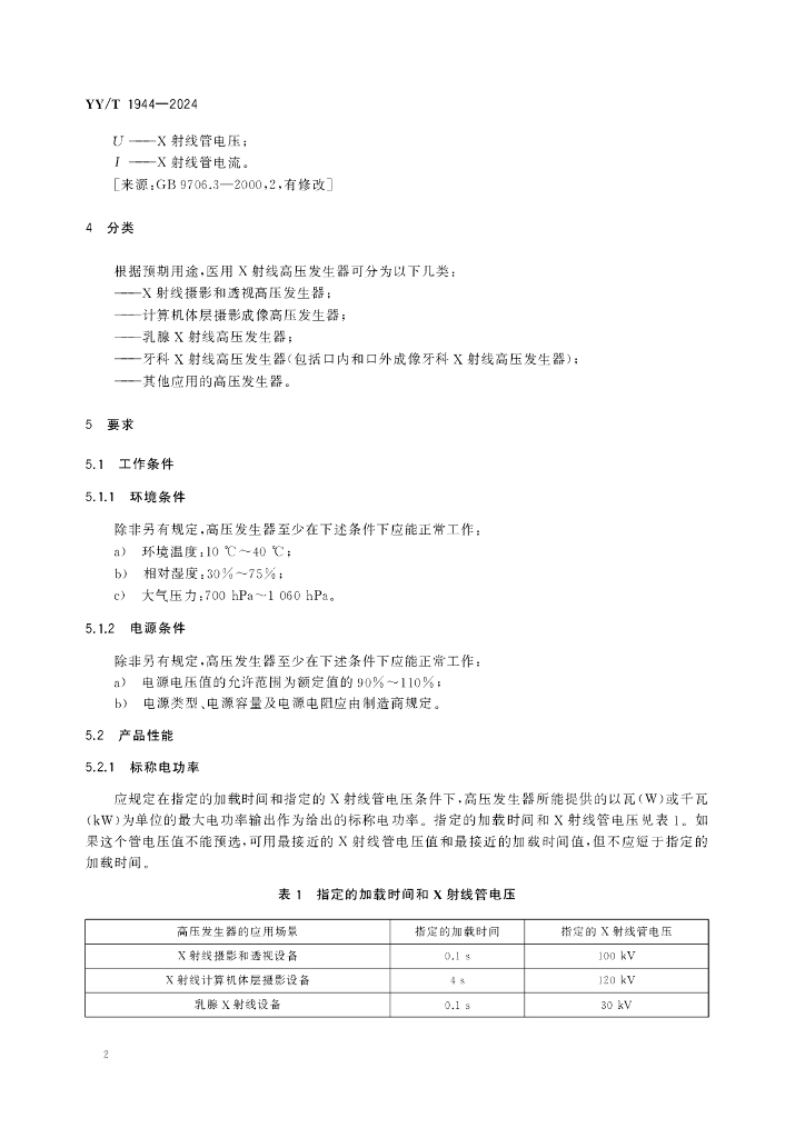 YY/T 1944-2024 医用X射线高压发生器专用技术条件