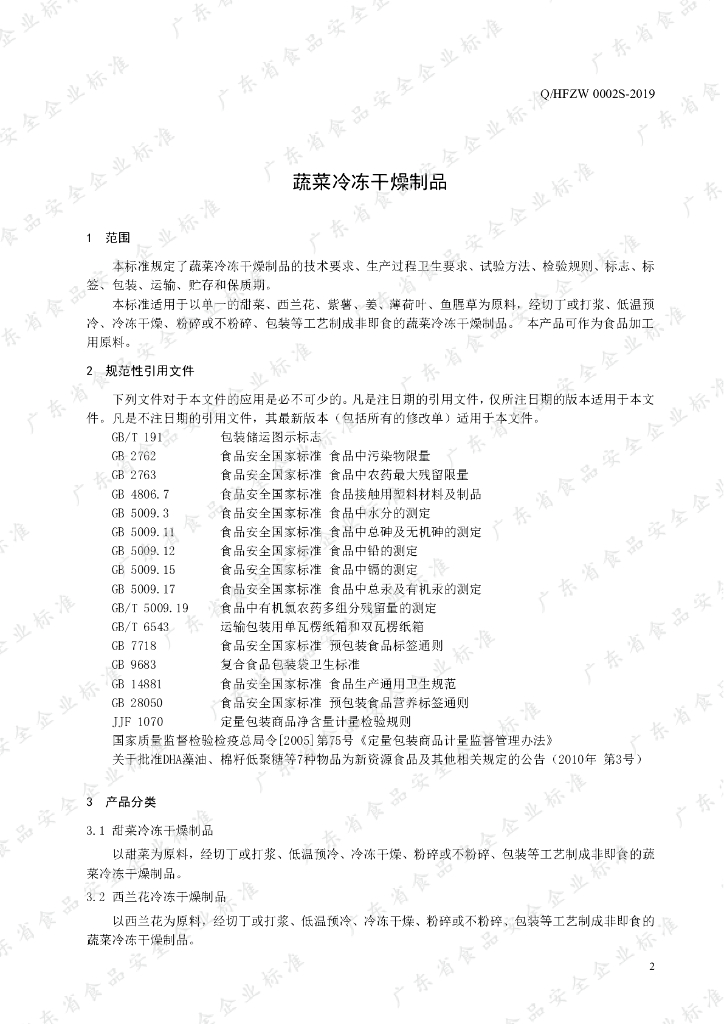 Q/HFZW 0002S-2019 蔬菜冷冻干燥制品
