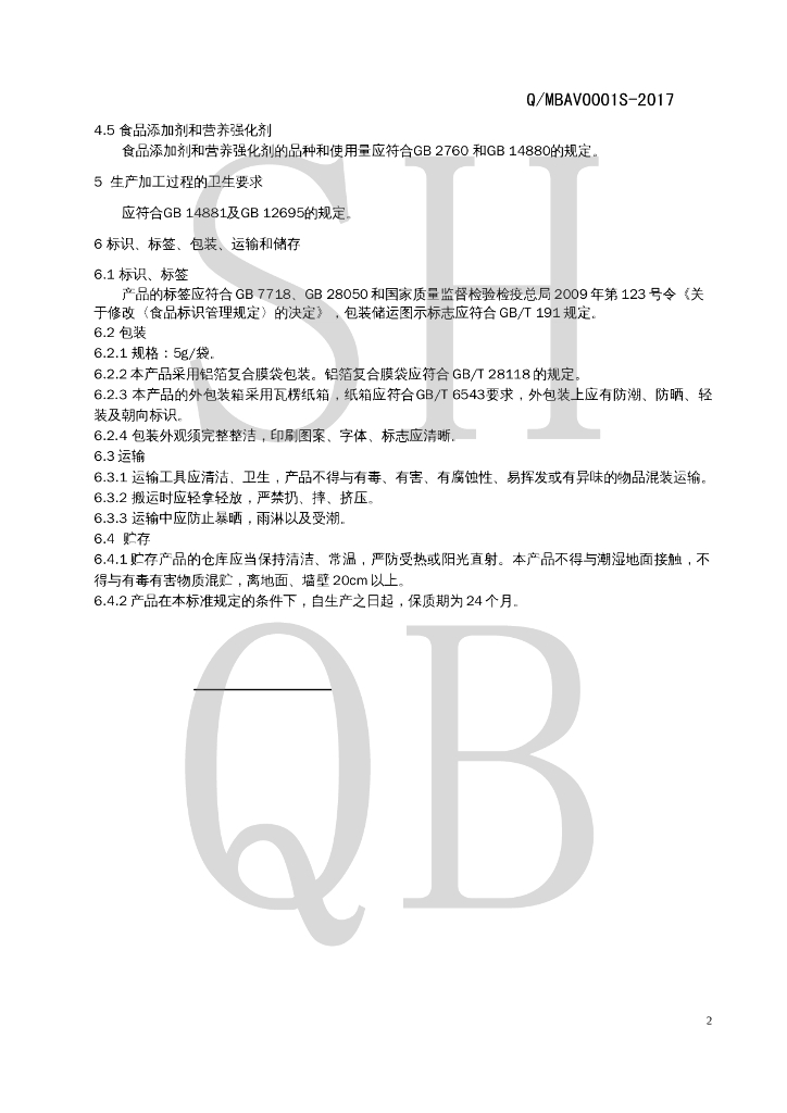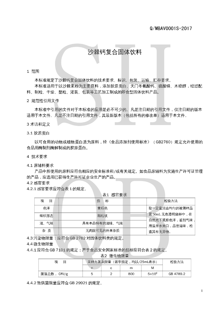 Q/MBAV 0001S-2017 沙棘钙复合固体饮料