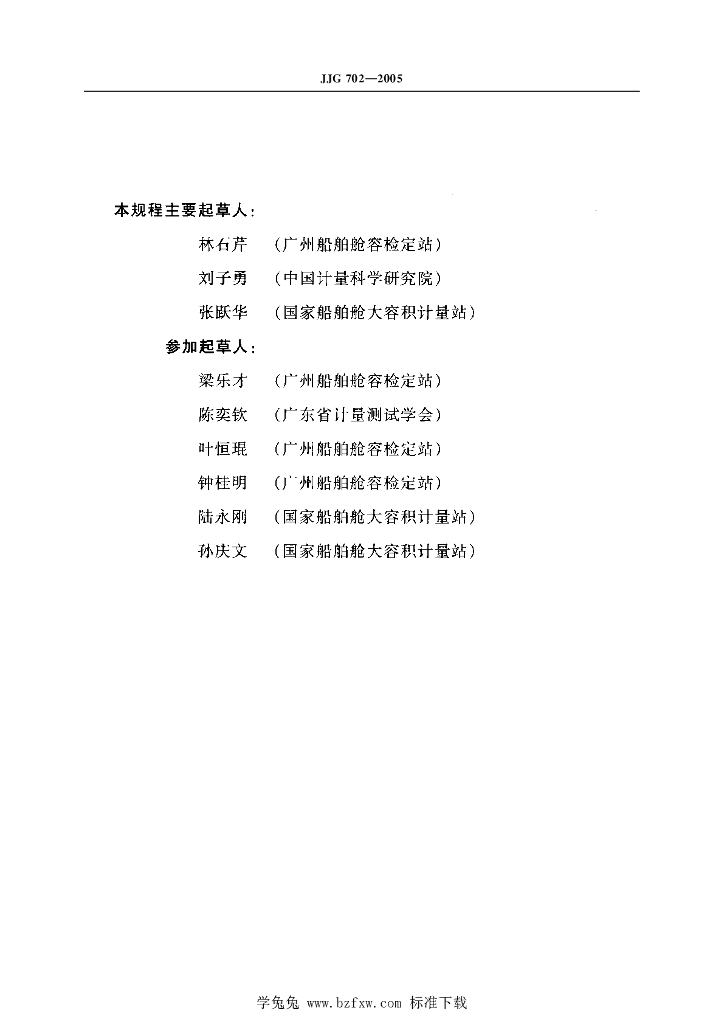 林石芹(广州船舶舱容检定站)、刘子勇(中国计量科学研究院)、张跃华(国家船舶舱大容积计量站)、梁乐才(广州船舶舱容检定站)、陈奕钦(广东省计量测试学会)、叶恒琨(广州船舶舱容检定站)、钟桂明(广州船舶舱容检定站)、陆永刚(国家船舶舱大容积计量站)、孙庆文(国家船舶舱大容积计量站)