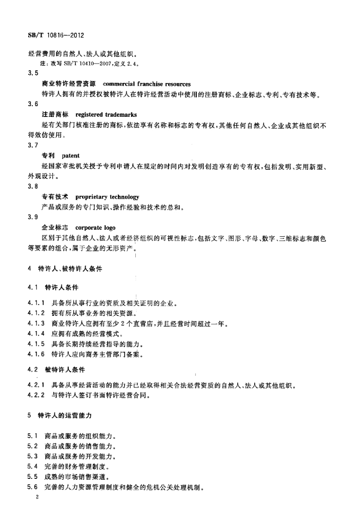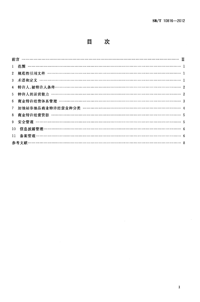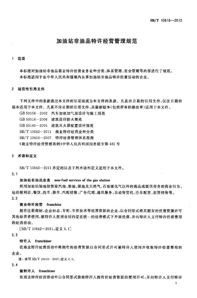 SB/T 10816-2012 加油站非油品特许经营管理规范
