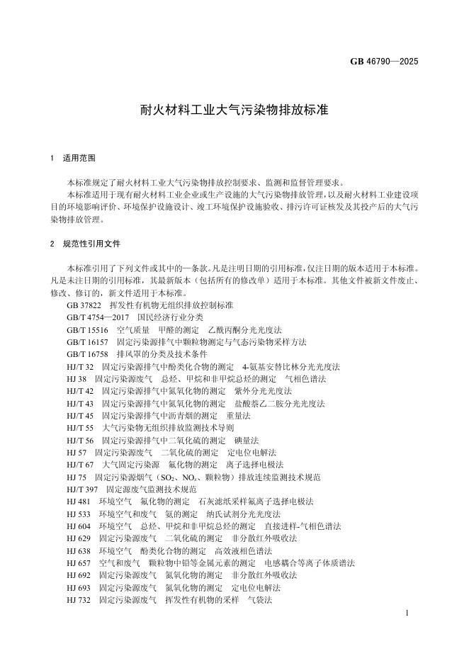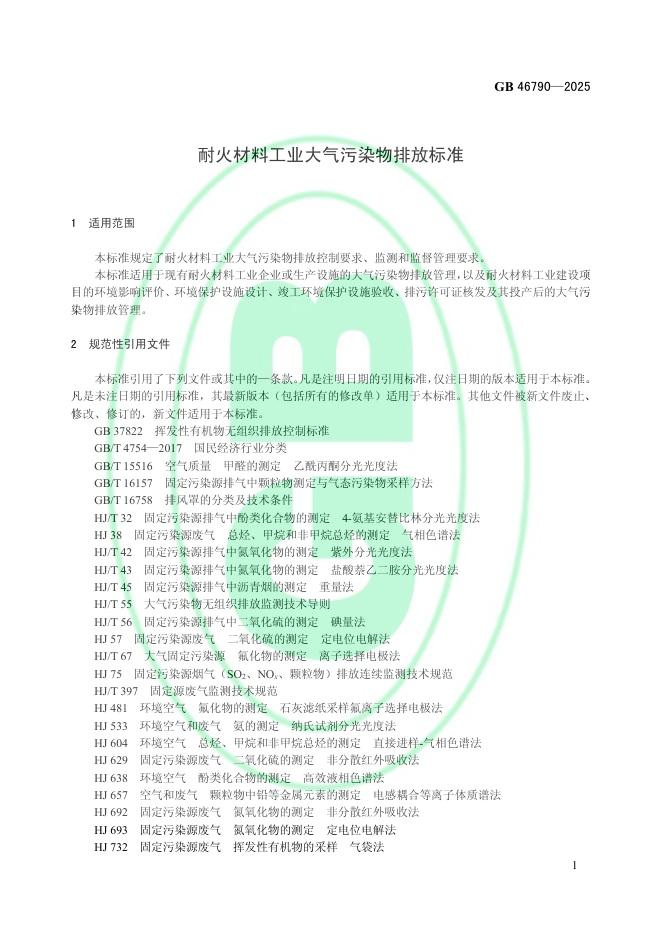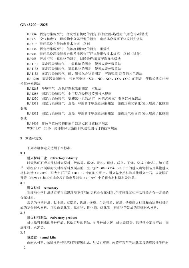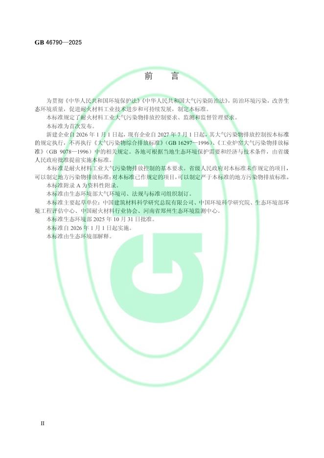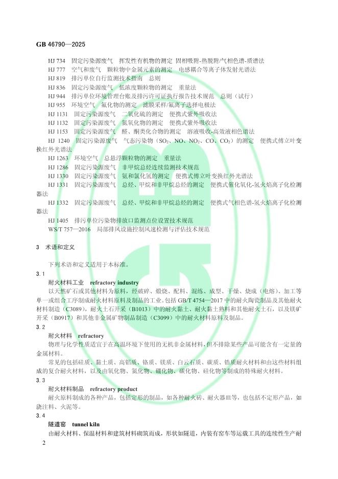 GB 46790-2025 耐火材料工业大气污染物排放标准