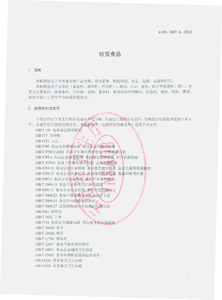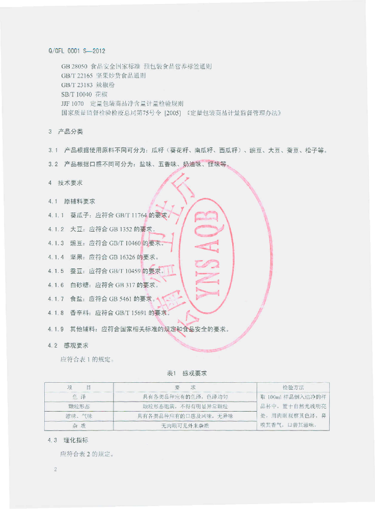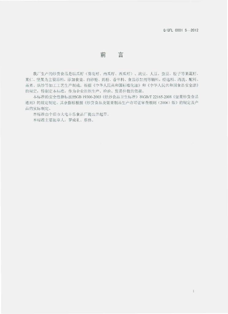 Q/FL 0001S-2012 炒货制品
