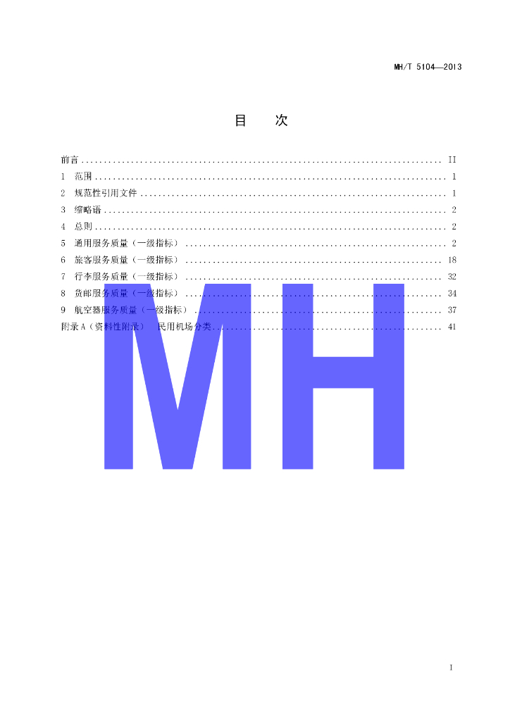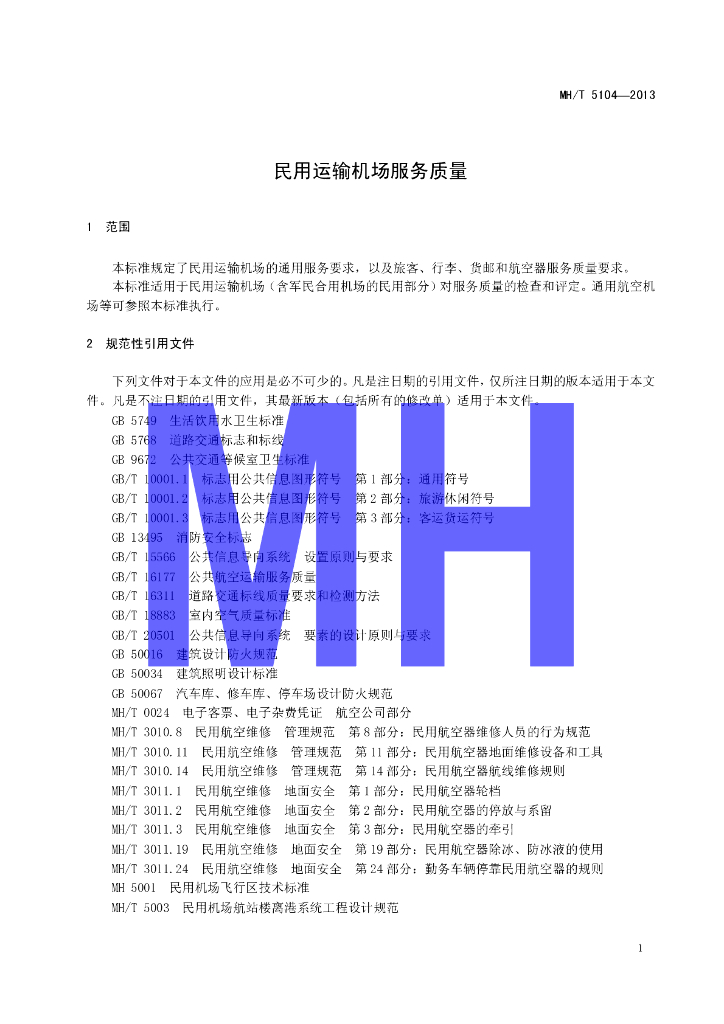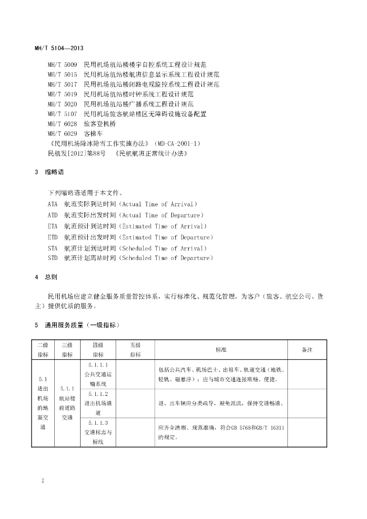 MH/T 5104-2013 民用运输机场服务质量