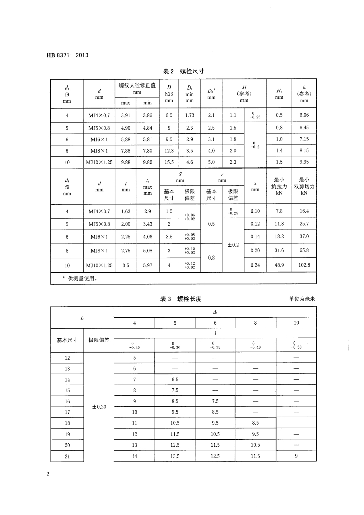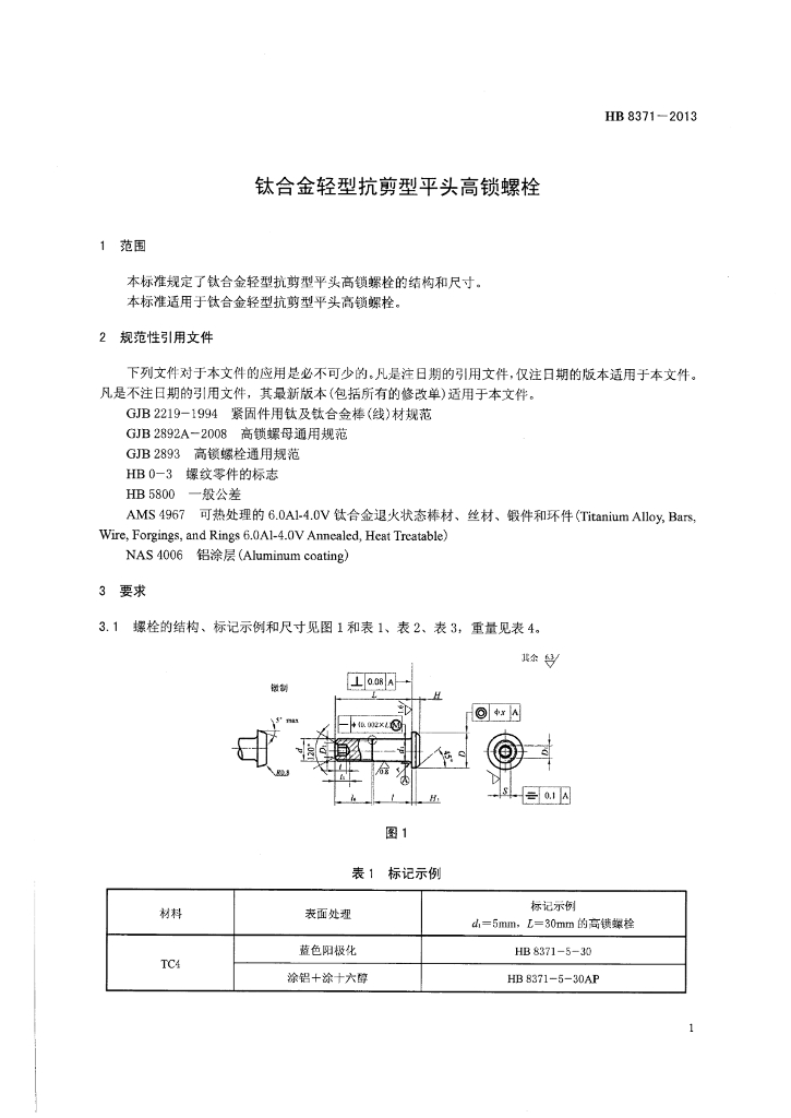 HB 8371-2013 钛合金轻型抗剪型平头高锁螺栓