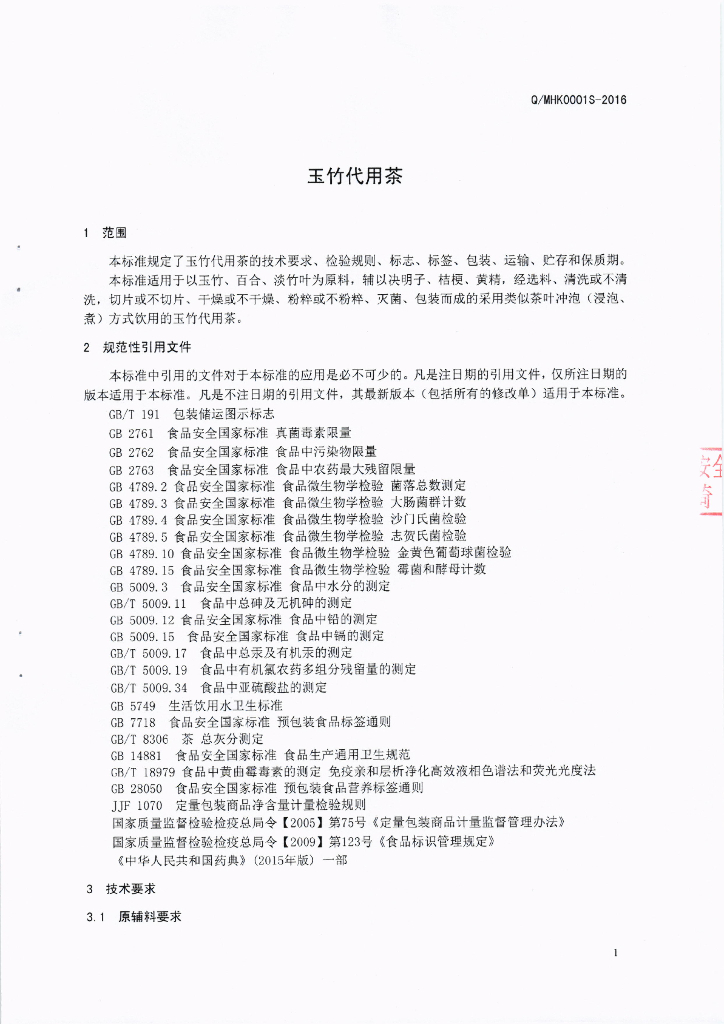 Q/MHK 0001S-2016 泸州岷宏科技有限公司 玉竹代用茶
