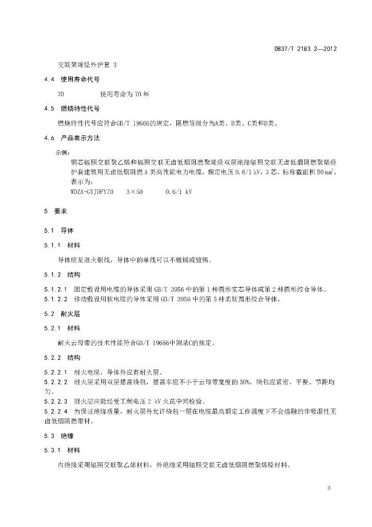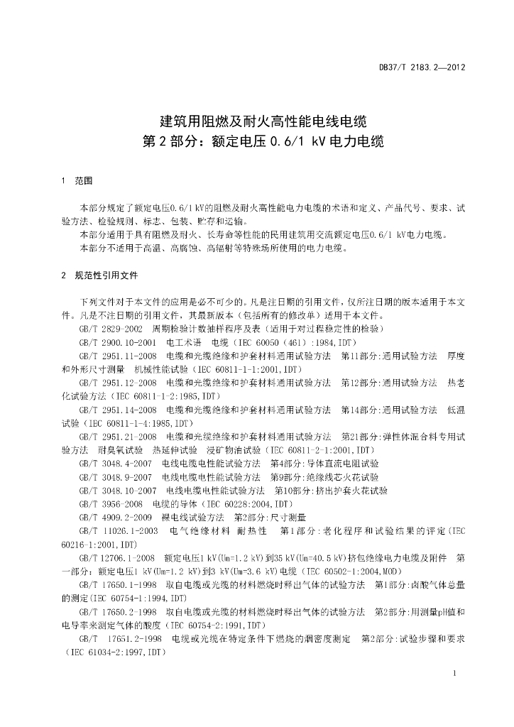 DB37/T 2183.2-2012 建筑用阻燃及耐火高性能电线电缆 第2部分:额定电压0.6/1KV电力电缆