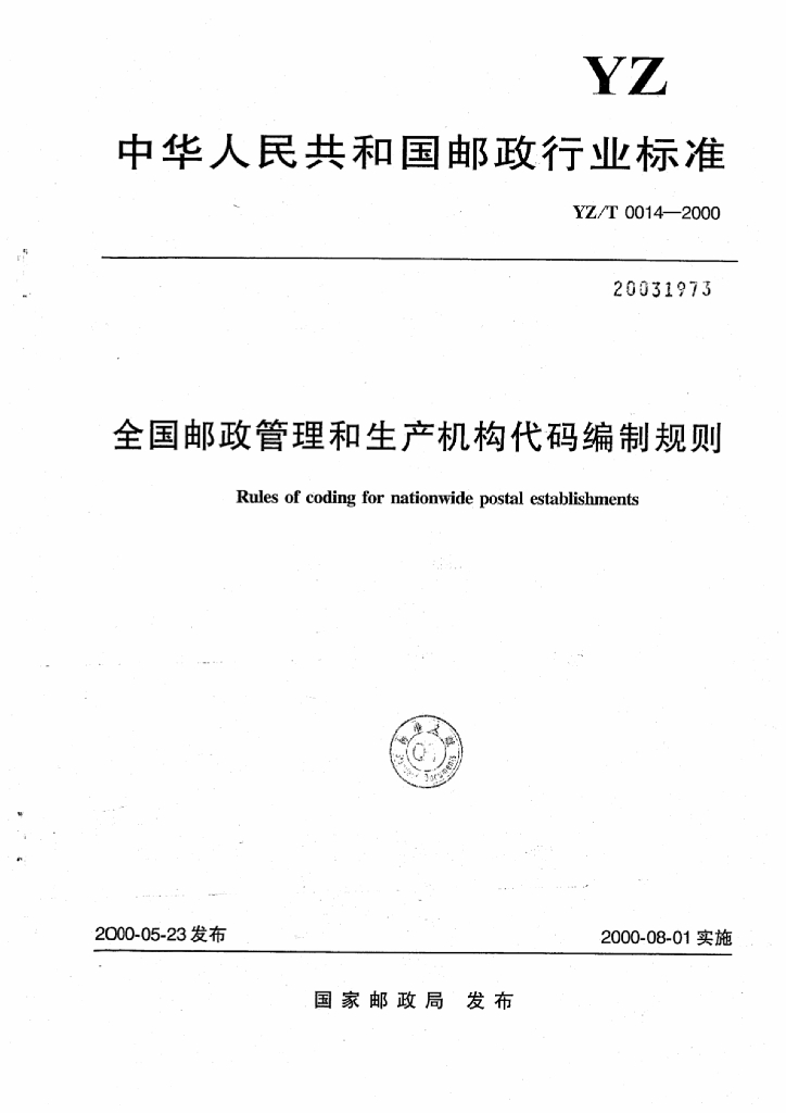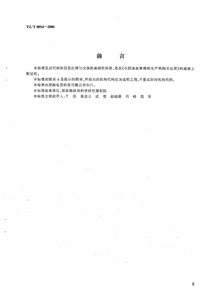 YZ/T 0014-2000 全国邮政管理和生产机构代码编制规则
