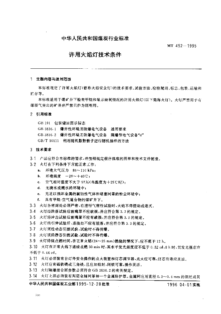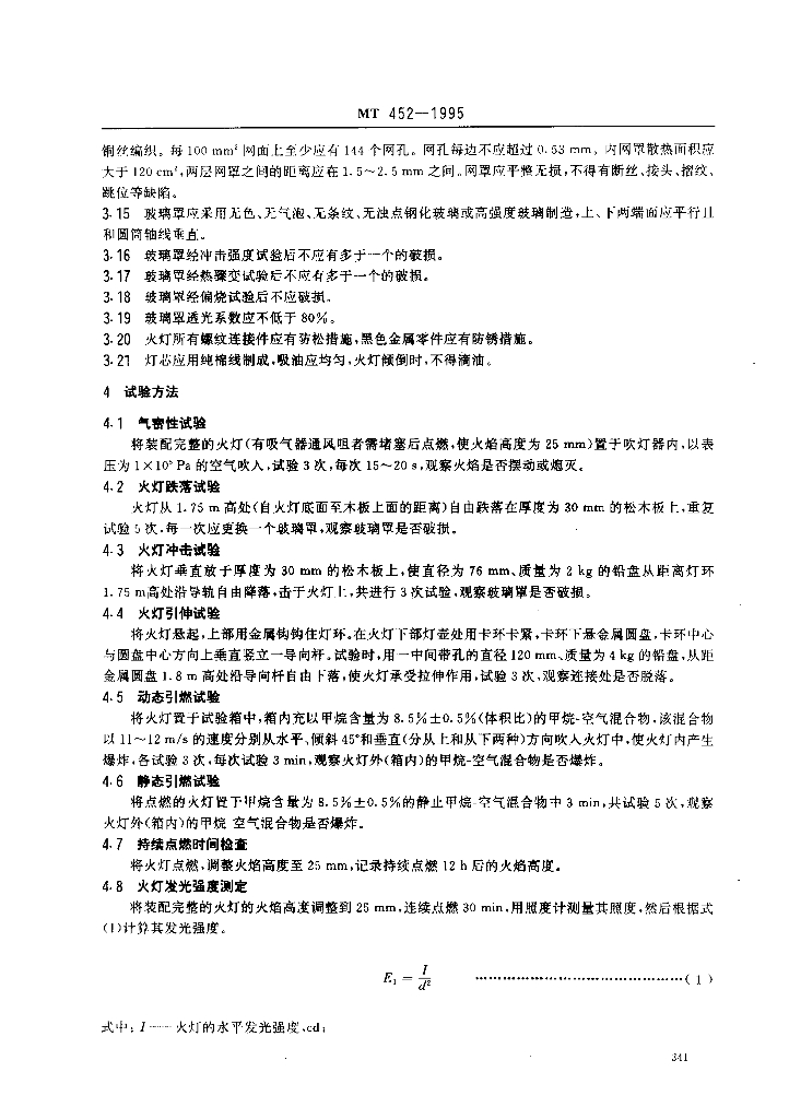 MT 452-1995 许用火焰灯技术条件