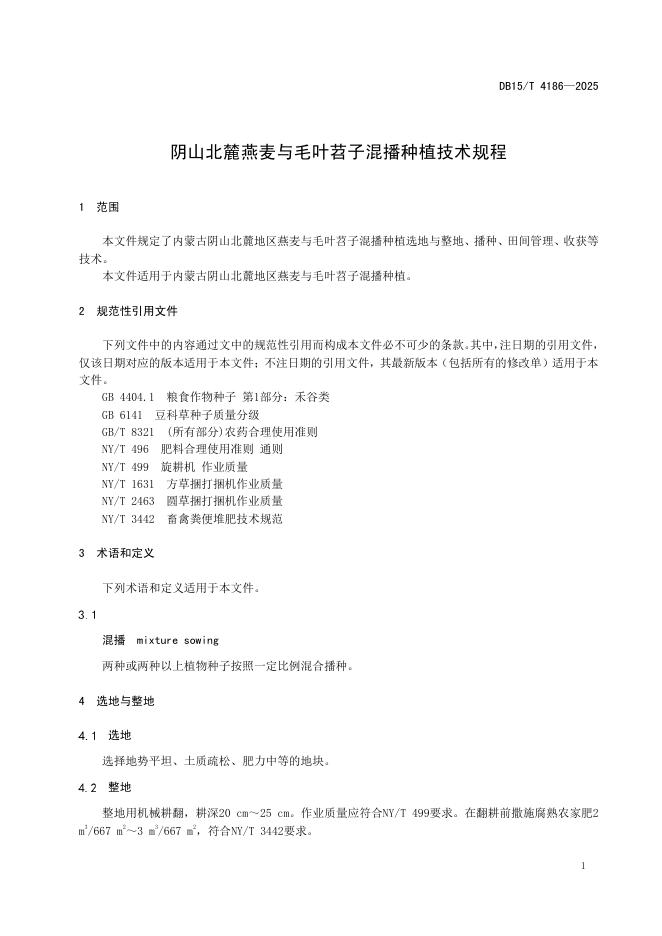 DB15/T 4186-2025 阴山北麓燕麦与毛叶苕子混播种植技术规程