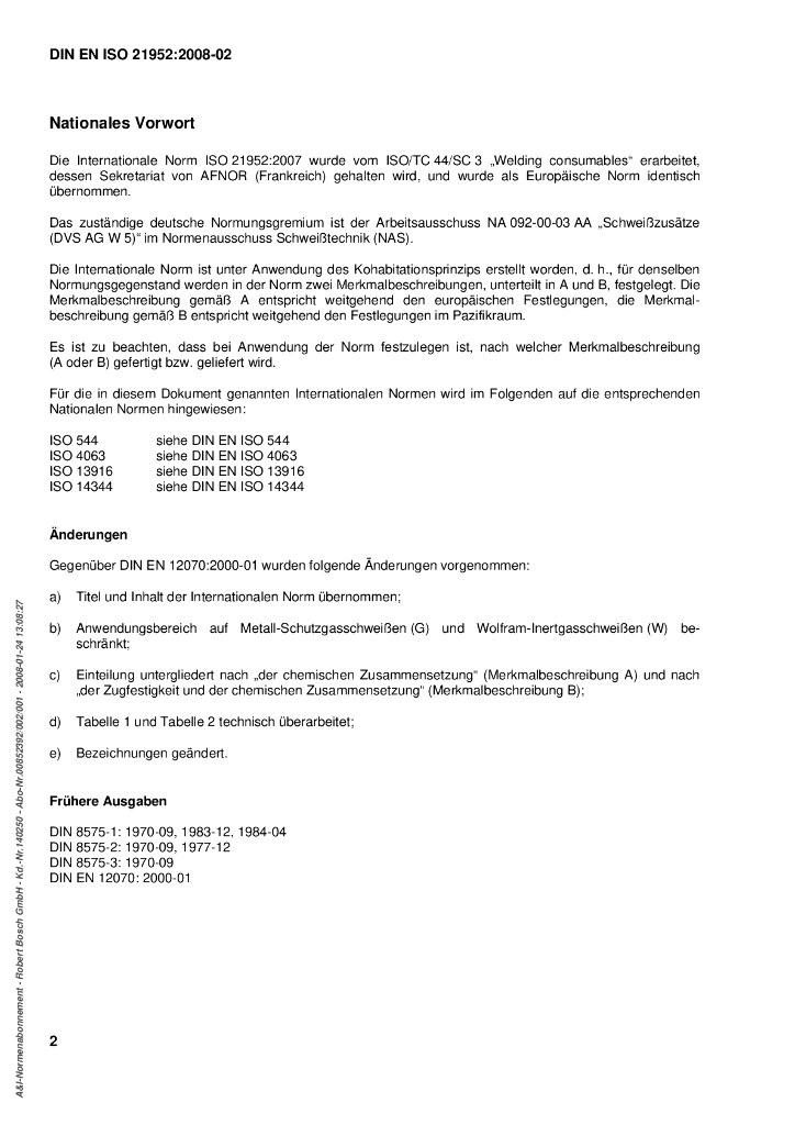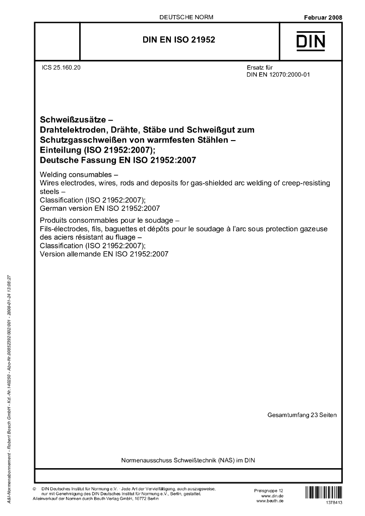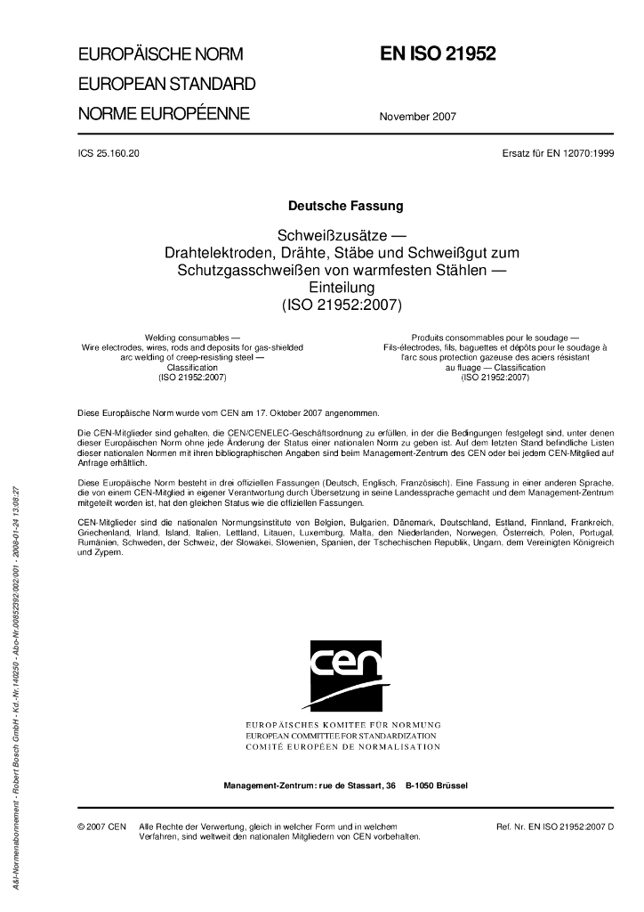 DIN EN ISO 21952-2008 焊接消耗品.抗蠕变钢的气体保护电弧焊接用丝状电极、焊丝、焊条和沉渍物.分类