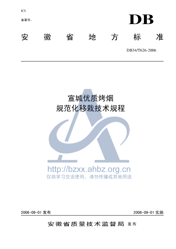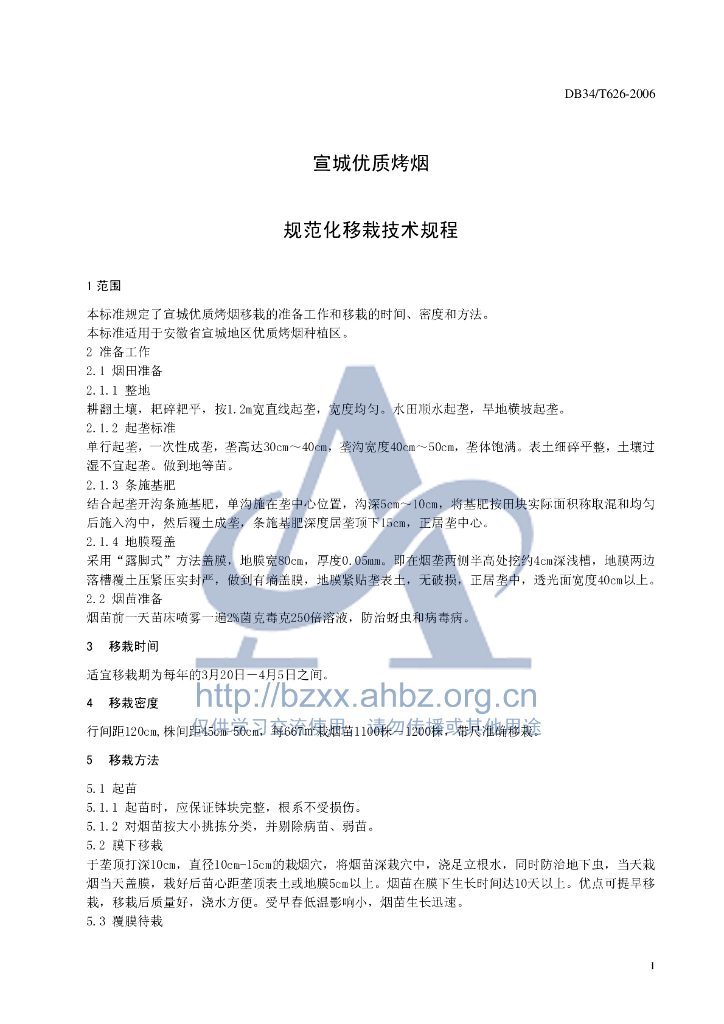 DB34/T 626-2006 宣城优质烤烟规范化移栽技术规程
