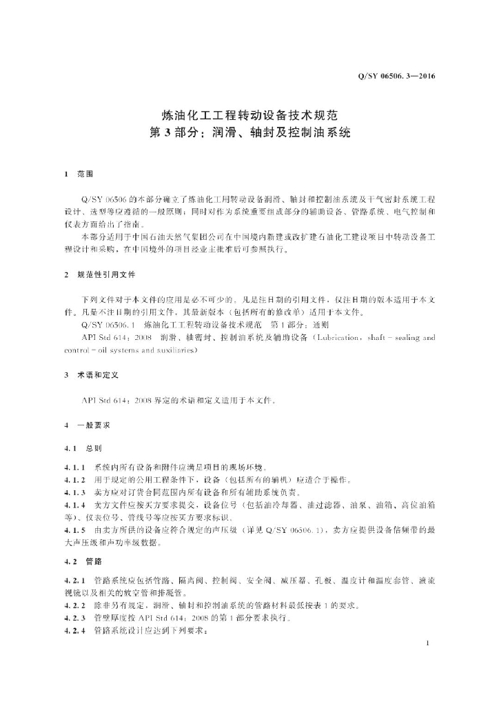 Q/SY 06506.1-2016 炼油化工工程转动设备技术规范 第3部分:润滑、轴封及控制油系统