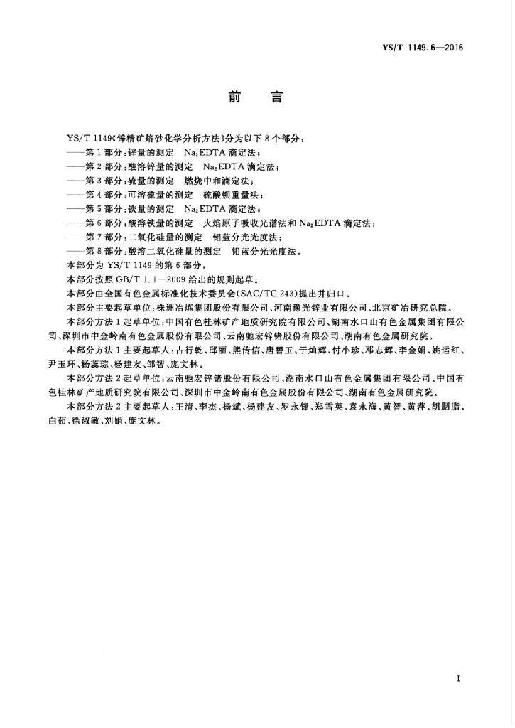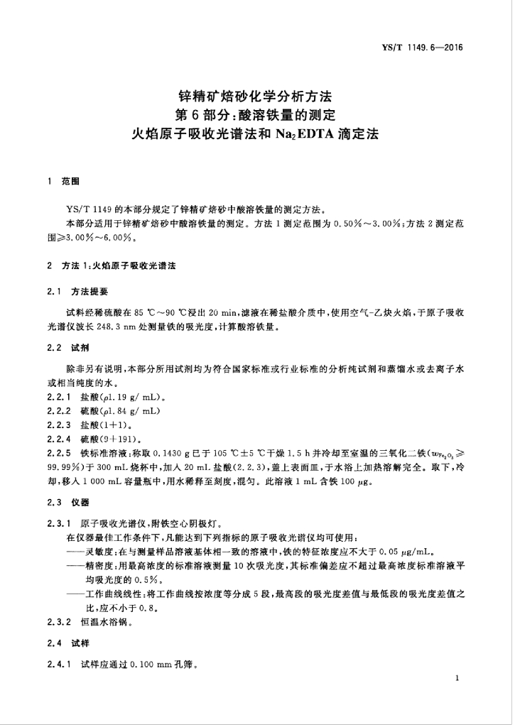 YS/T 1149.6-2016 锌精矿焙砂化学分析方法 第6部分:酸溶铁量的测定 火焰原子吸收光谱法和Na2EDTA滴定法