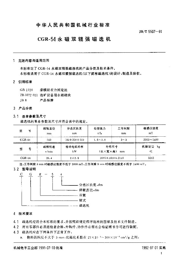 JB/T 5507-1991 CGR-54永磁双辊强磁选机