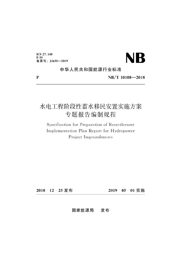 NB/T 10108-2018 水电工程阶段性蓄水移民安置实施方案专题报告编制规程