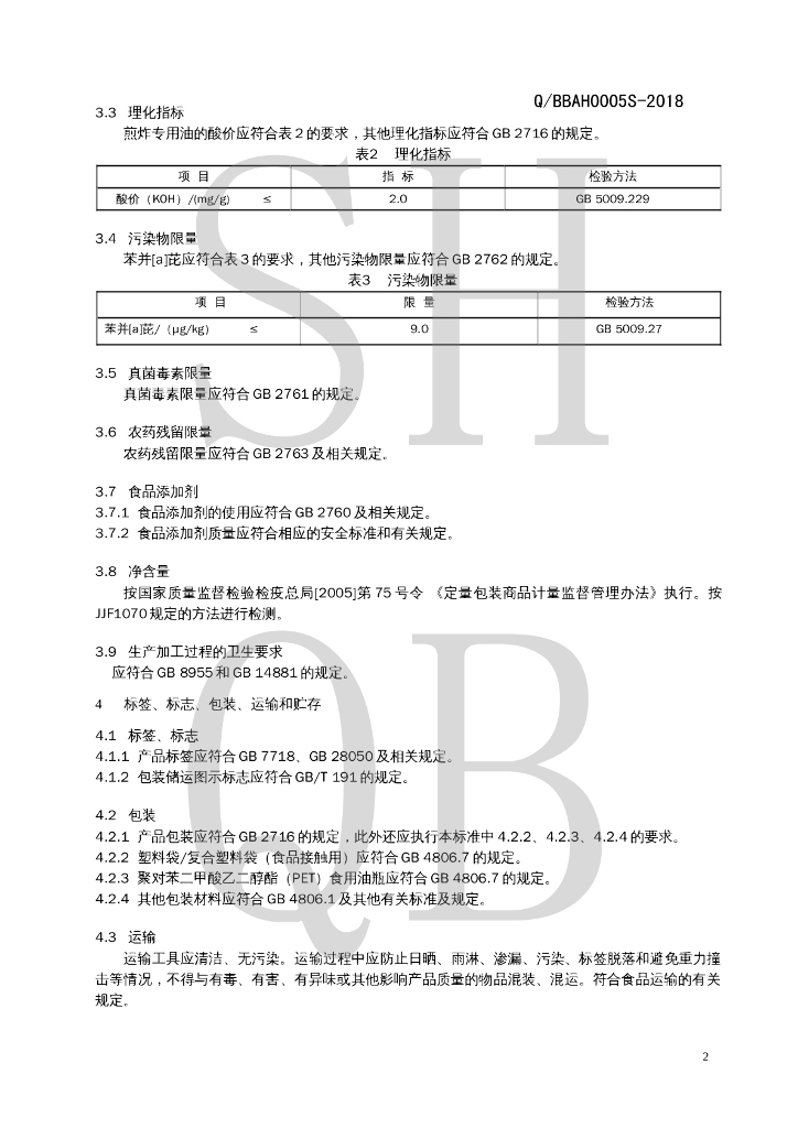 Q/BBAH 0005S-2018 煎炸专用油