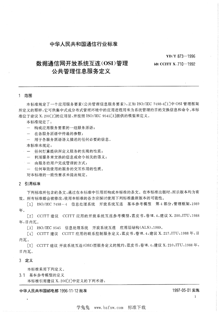YD/T 873-1996 数据通信网 开放系统互连(OSI)管理 公共管理信息服务定义