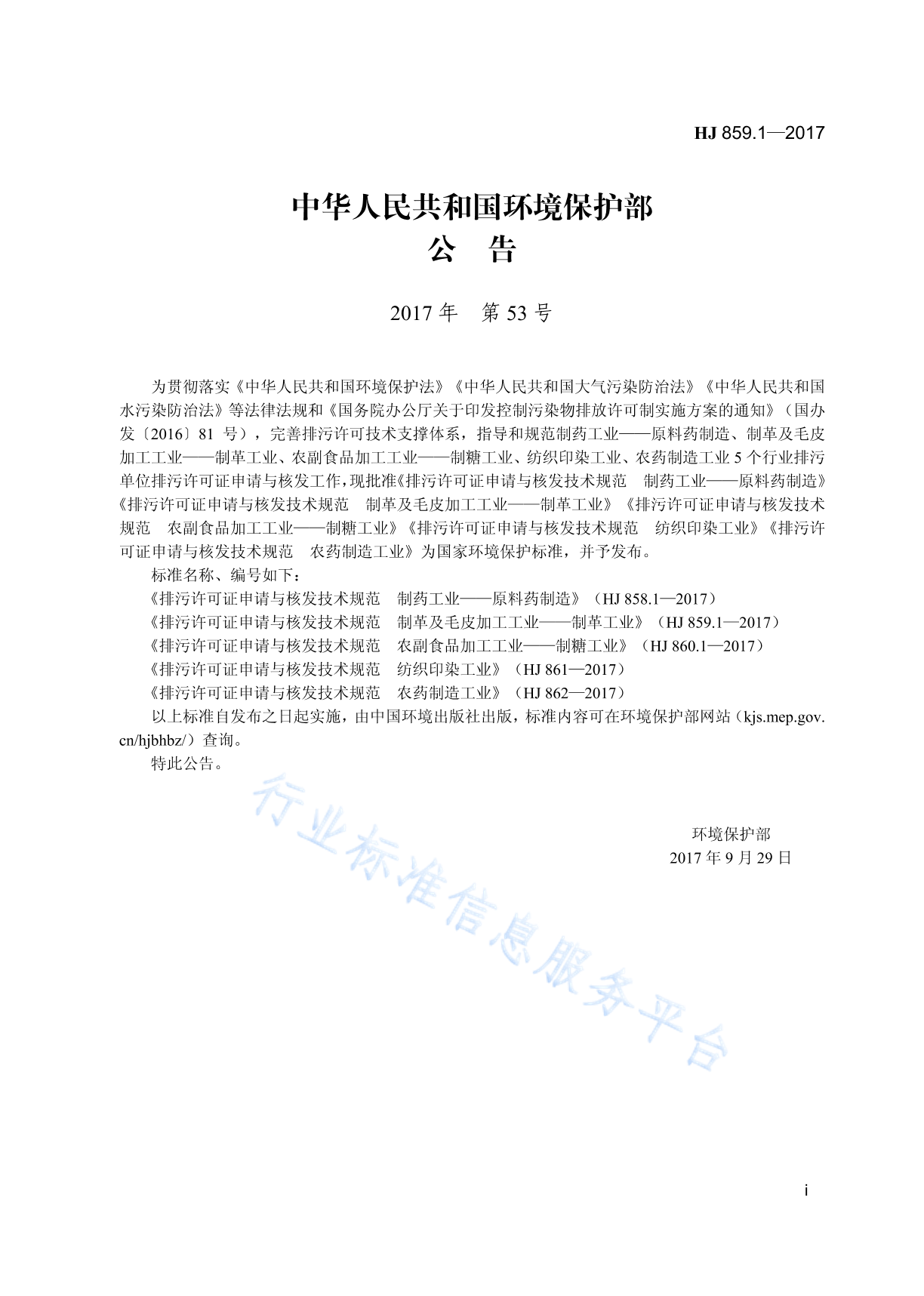 HJ 859.1-2017 排污许可证申请与核发技术规范 制革及毛皮加工工业-制革工业