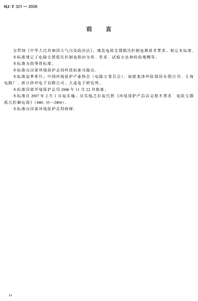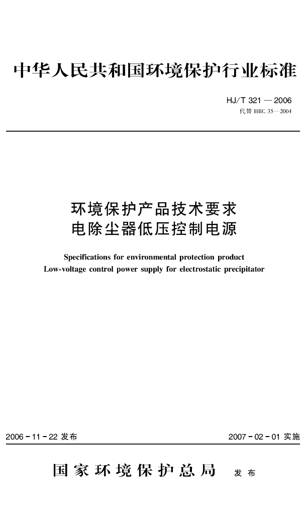 HJ/T 321-2006 环境保护产品技术要求 电除尘器低压控制电源