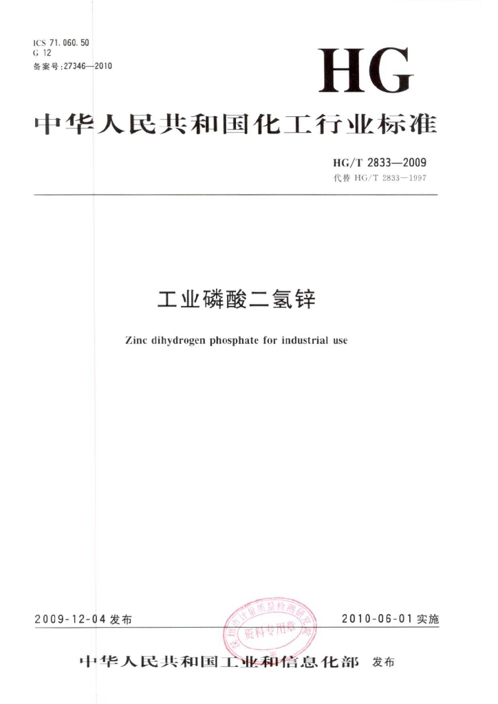 HG/T 2833-2009 代替 HG/T 2833-1997 工业磷酸二氢锌