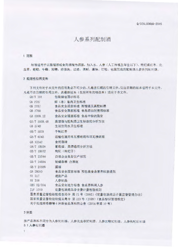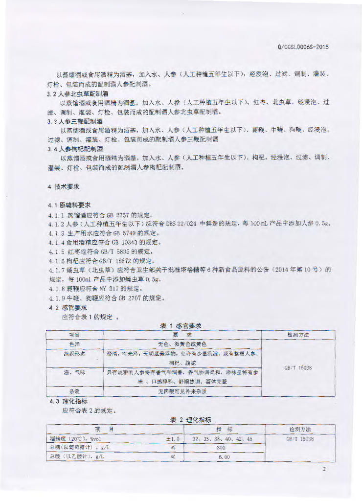 Q/JLGD 0003S-2015 吉林市关东老酒坊酒业有限公司 人参系列配制酒