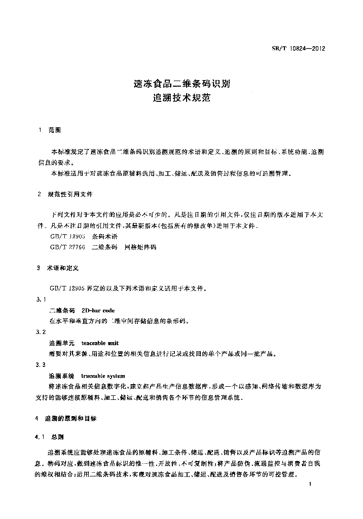 SB/T 10824-2012 速冻食品二维条码识别追溯技术规范