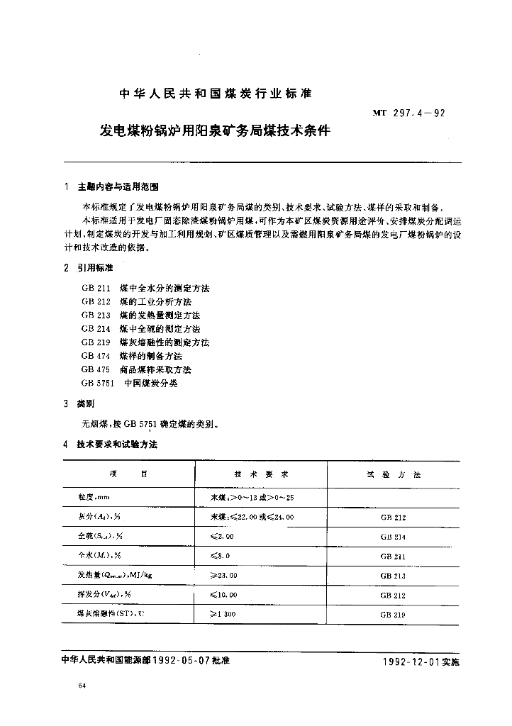MT 297.4-1992 发电煤粉锅炉用阳泉矿务局煤技术条件