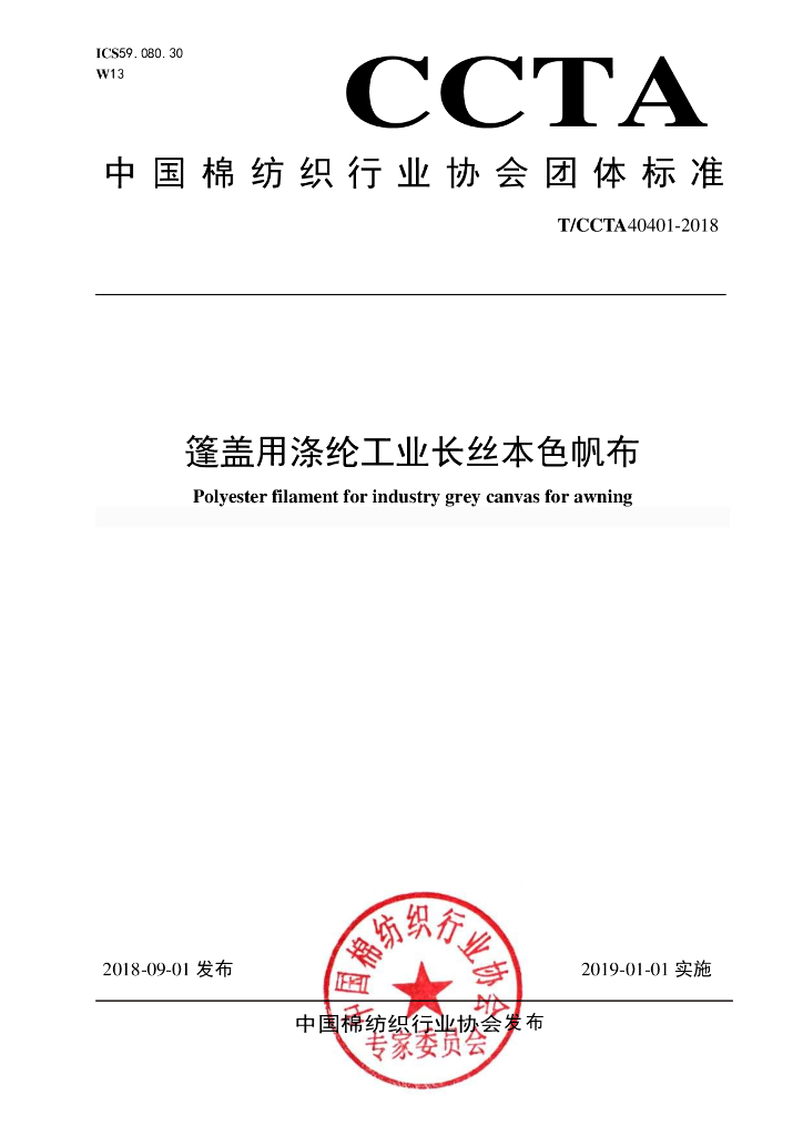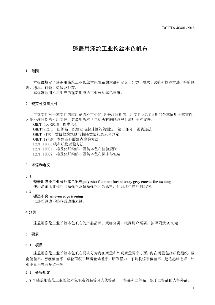 T/CCTA 40401-2018 篷盖用涤纶工业长丝本色帆布