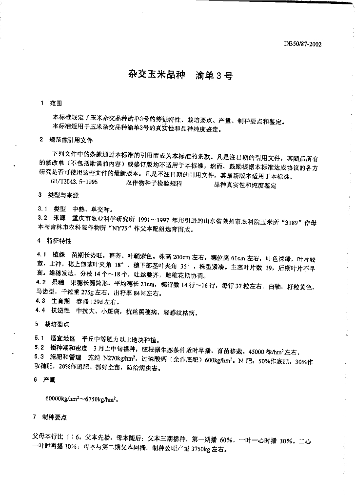DB50/ 87-2002 杂交玉米品种 渝单3号