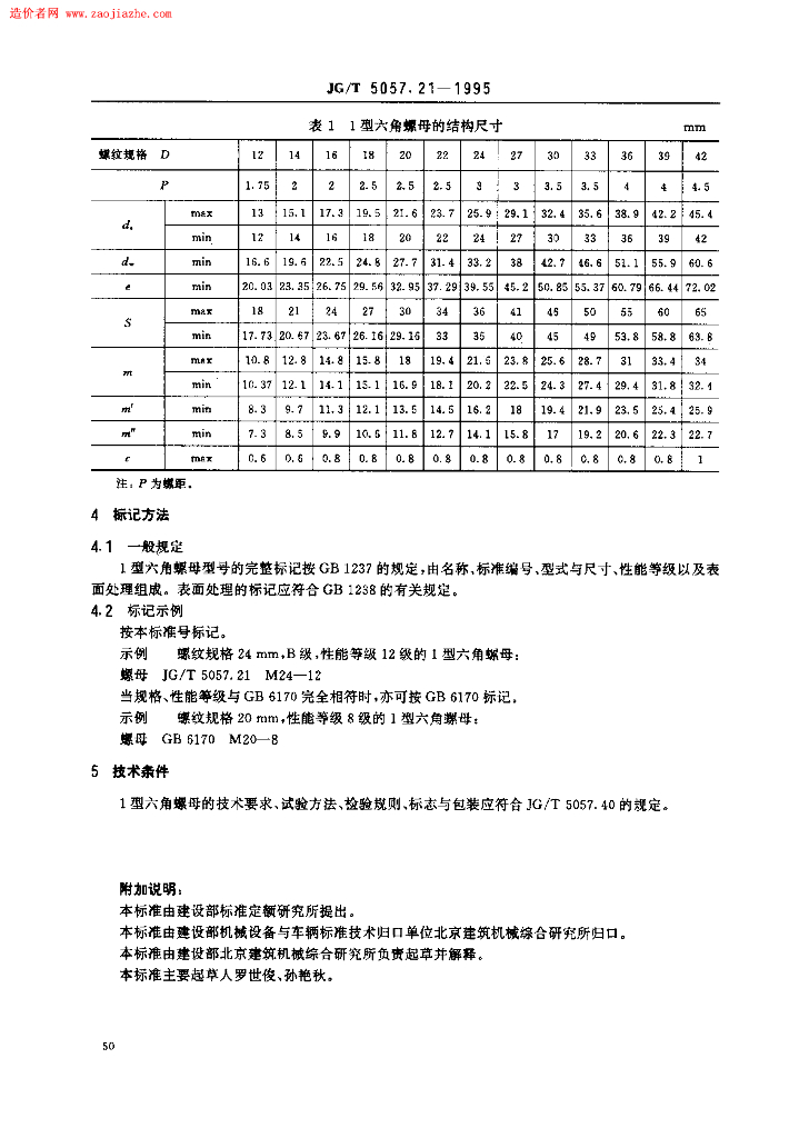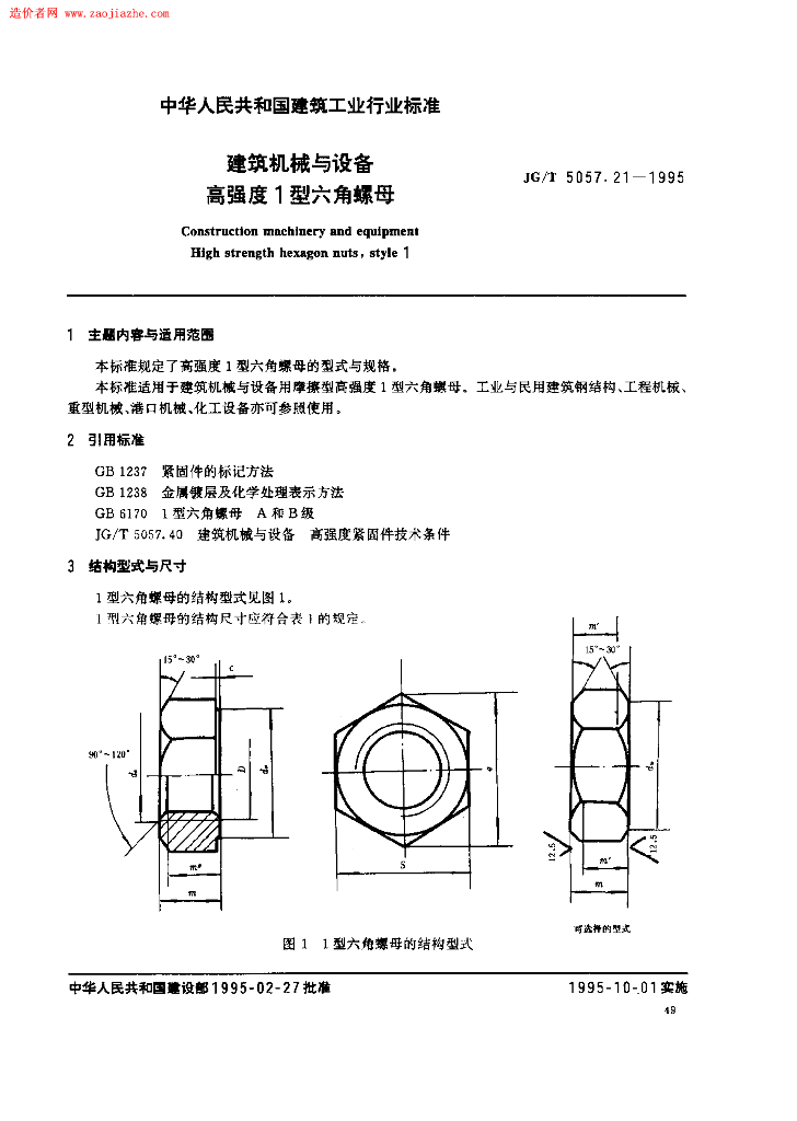 JG/T 5057.21-1995 建筑机械与设备高强度1型六角螺母规范